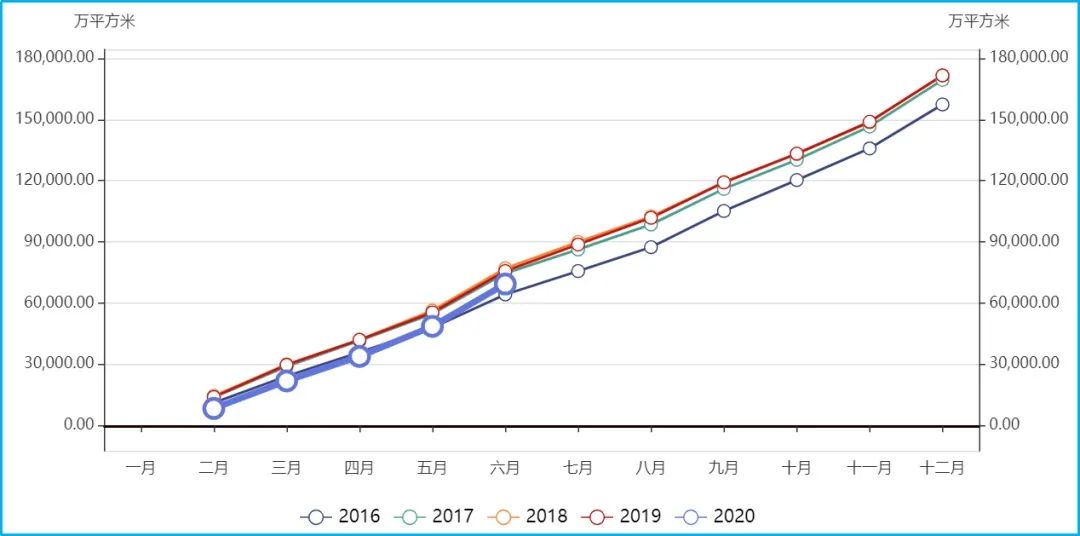 图:2020年6月,商品房累计销售面积快速上升