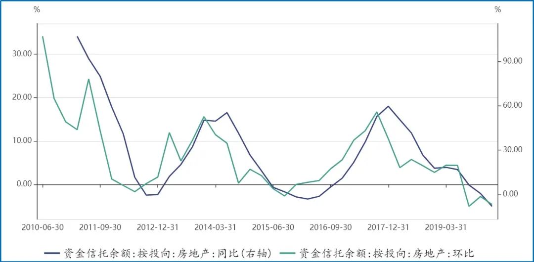 图:信托投向房地产的资金同比增速2018年来持续下滑