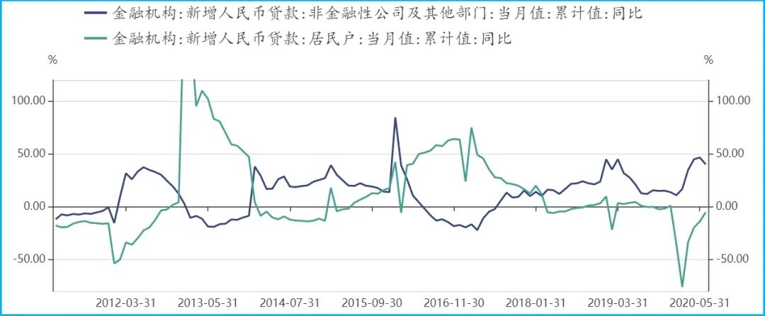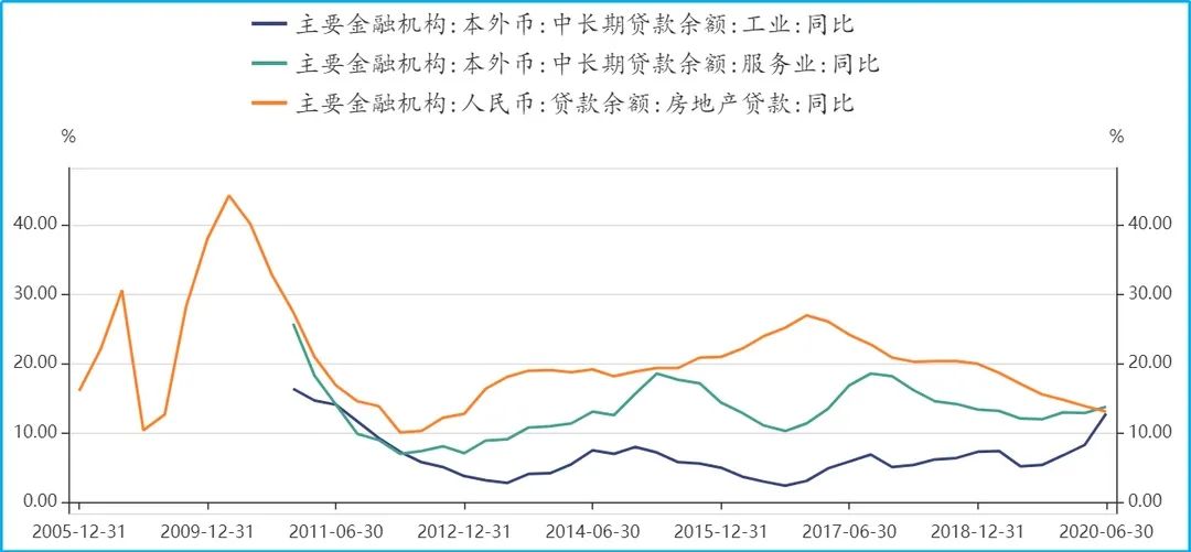 而企业获得的贷款主要面向了工业与服务业。截至2020年二季度,工业与服务业中长期贷款余额分别为10.01万亿元和42.70万亿元,同比增速分别为12.8%和13.8%,如下图,工业与服务业贷款余额增速快速上涨,而房地产贷款余额增速持续下降。