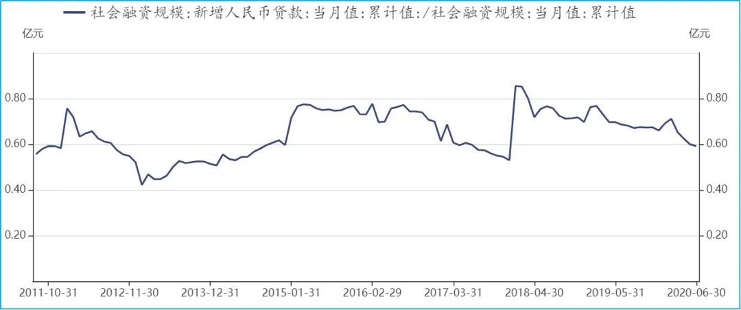 2020年上半年,社会融资规模新增20.83万亿元,比去年同期增加了6.22万亿元,其中新增人民币贷款12.33万亿元,占了新增社融的59%,今年来人民币贷款占新增社融比重下降。