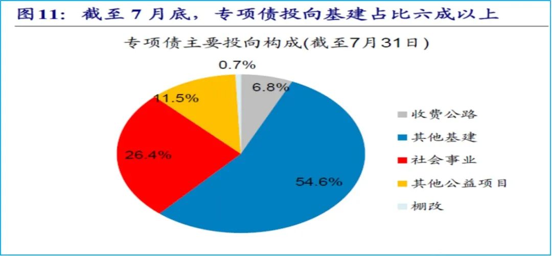 政府专项债使用遵循有一定收益的公益性项目,融资规模与项目收益相平衡原则,主要用于基建,少部分用于社会事业。