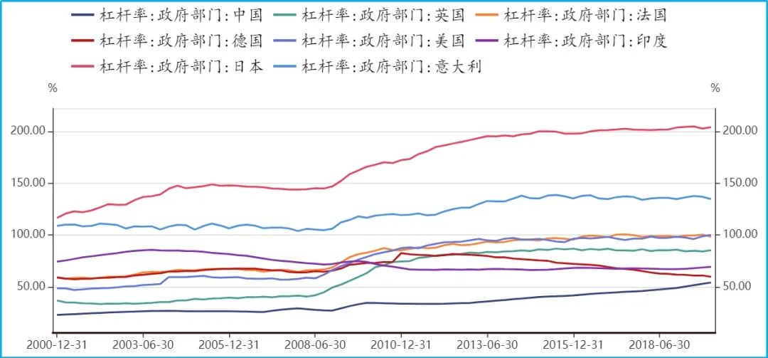 图:2019年底,中国政府部门杠杆率54%低于G7国家